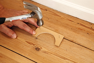 Du kan lage et par klosser av en 6 mm platebit, som du sager ut en runding eller firkant i, som passer til sofaens bein. Spikre klossene fast til gulvet med små stifter, så langt fra veggen at sofaen ikke kan skade tapetet.