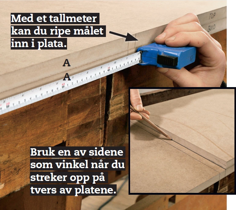 Merk alle delene nøyaktig på framkanten med navn og ei pil som viser hva som er opp. Nøyaktige mål og rette vinkler er viktig. Har du ikke ei god bordsirkelsag eller ei dykksag med skinne, får du delene skåret opp i trelastutsalget.