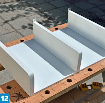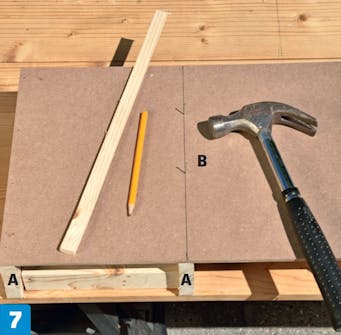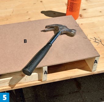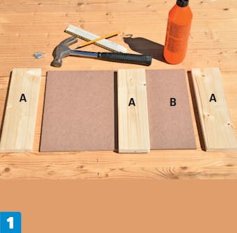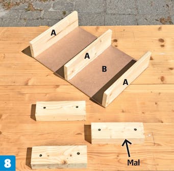 Lag en mal. Skru fast tre trestumper med en lengde som tilsvarer avstanden mellom skilleveggene på arbeidsbordet. Sett på plass skilleveggene (A), og smør lim på den helt til venstre.