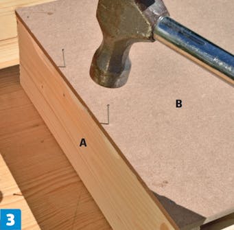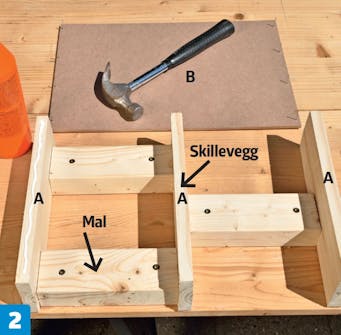 Bunnen (B) spikres fast. Spikre fast bunnen til skilleveggen (A) med 1,7 x 35 mm dykkert. Bruk 3-5 dykkert til hver skillevegg. Alternativt kan du bruke en spikerpistol.