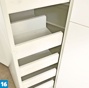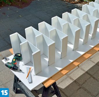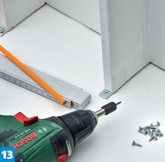 Hyllene monteres til døren. Hvis du har laget ti hyller, plasseres de med ca 10 cm avstand. Skru fast med 3,5 x 16 mm skruer.