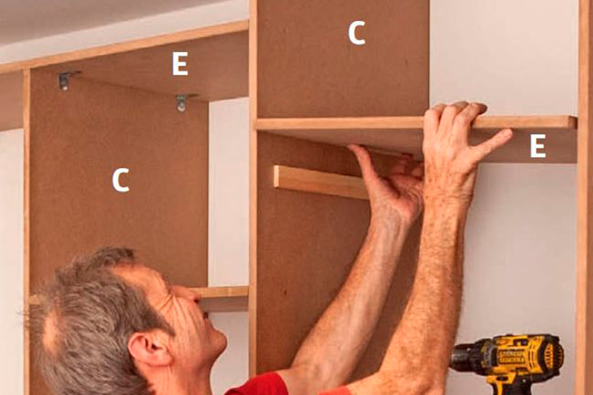 Vegger og elementer sages i skapets fulle dybde, mens bærelistene skal være omkring 5 cm kortere.
