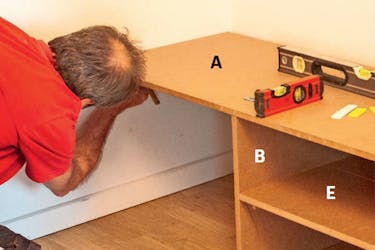 Sokkelen løftes på plass og klosses opp. Når den er helt i vater, monteres det bærelister (H) i sidene til å holde sokkeltoppen (A). Innfestingen avhenger av veggen. Her bruker vi to 4 x 50 mm skruer og plugger.