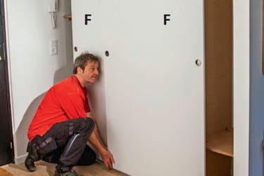 Skapets nedre sokkeldel settes sammen før den flyttes på plass, klosses opp og monteres. Etterpå bygges resten av skapet oppå den.