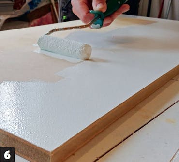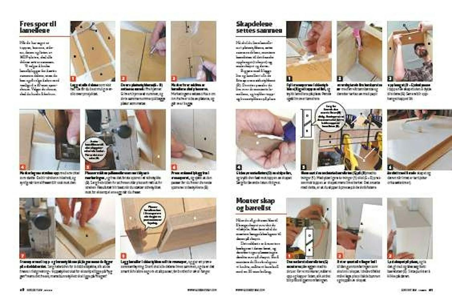 Nå skal du lime lamellene i platestykkene, sette sammen delene, montere bærelisten til det franske opphenget (i skapet) og male skapet og døren.