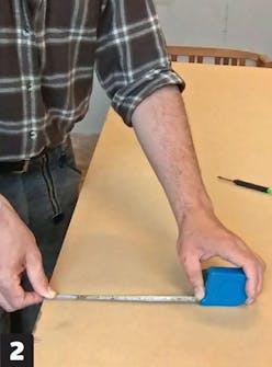 Marker hvor midten av lamellene skal plasseres. Markeringene settes cirka 5 cm inn fra hver side av platene, og går over begge.