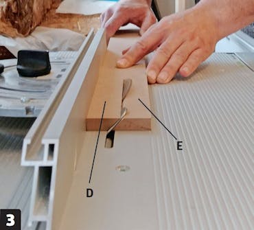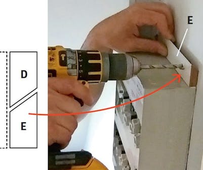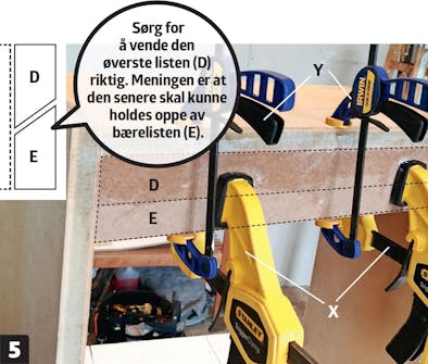 Klem fast den nederste bærelisten (E) på (D) med to tvinger (X). Med ytterligere to tvinger (Y) skal (E + D) presses mot toppen av skapet mens limet tørker. Det smarte med dette, er at du slipper å presse på de skrå flatene.