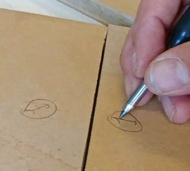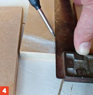 Markeringene strekes opp med en vinkel som støtte. Da blir streken vinkelrett, og synlig når lamellfresen blir satt mot den.