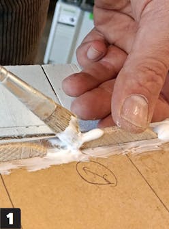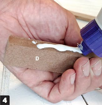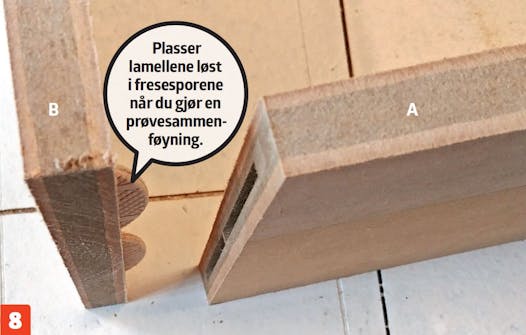 Fyll fresesporene i sidestykkene (B) godt opp med lim, og trykk lamellene på plass. Pensle også lim over lamellene.