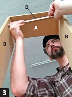 Gi den øverste listen (D) en stripe lim, og trykk den fast mot toppen av skapet. Sørg for å vende listen riktig vei.