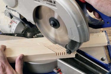 Du får bruk for en kapp-/gjærsag til bladskjøtene som holder skapets frontramme sammen. Med sagens dybdestopp kan du skjære en rekke snitt halvt ned i hver list, og deretter fjerne treverket med et skarpt stemjern.