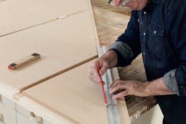 Bruk det avskårne stykket fra den minste døren til enten å blende åpningen ytterst til høyre, eller til skuffefront. Legg opp platestykket, og strek opp slik at det flukter med de skrått avsagde dørene.