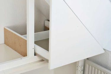 For å utnytte plassen fullt ut, har vi dessuten laget en liten skuffmed trekantet front, lengst inne under skråveggen.