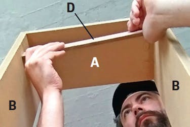 Gi den øverste listen (D) en stripe lim, og trykk den fast mot toppen av skapet. Sørg for å vende listen riktig vei.