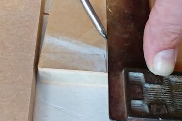 Markeringene strekes opp med en vinkel som støtte. Da blir streken vinkelrett, og synlig når lamellfresen blir satt mot den.