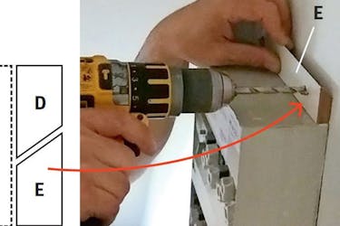 Klem fast den nederste bærelisten (E) på (D) med to tvinger (X). Med ytterligere to tvinger (Y) skal (E + D) presses mot toppen av skapet mens limet tørker. Det smarte med dette, er at du slipper å presse på de skrå flatene.