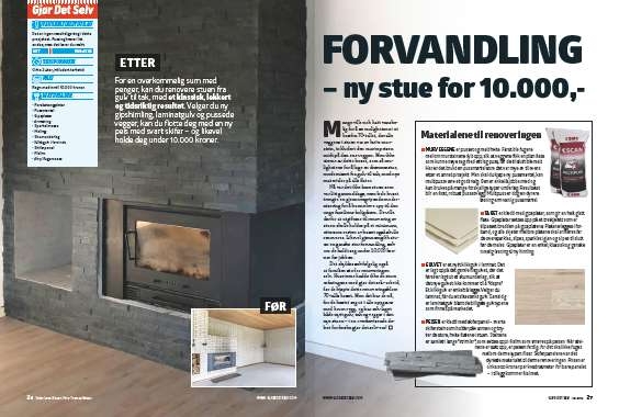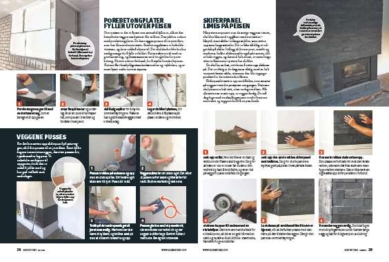 PEISEN er kledd med skiferpanel - svarte skiferstein som holder på varmen og bryter de store, hvite flatene i stuen. Steinene er samlet i lange “strimler”, som settes opp i flislim som smøres på peisen. Når stei nene er satt opp, er peisen ferdig, for det skal ikke fuges mellom denne typen fliser. Skiferpanelene var det dyreste materialet til denne renoveringen. Prisen er cirka 500 kroner per kvadratmeter for bare panelet - i tillegg kommer flislimet.