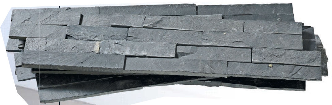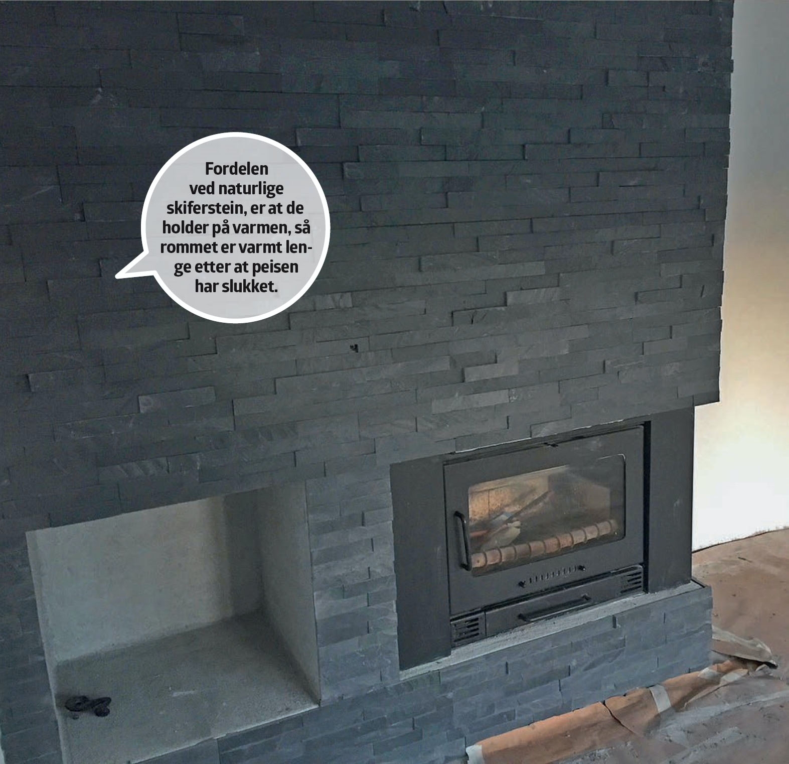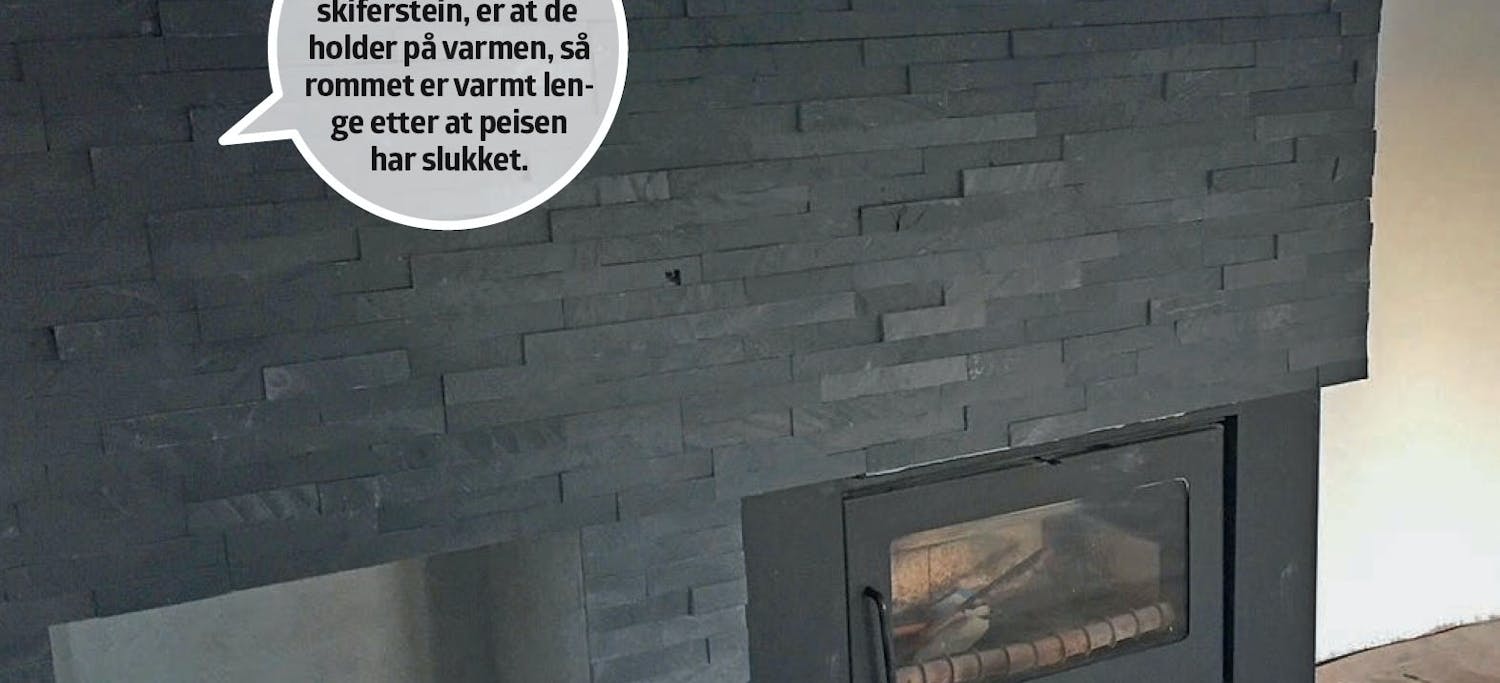 Når peisen er pusset som de øvrige veggene i stuen, skal den kles med veggfliser med naturstein - kløyvd, svart skifer i avlange stykker, som settes opp som lange strimler. Det er ikke tilfeldig at valget falt på skifer. I tillegg til å være pent, rustikt og moderne, holder skiferpanelet også på varmen, slik at hele veggen, og dermed hele stuen, er varm lenge etter at flammene i peisen har slukket.