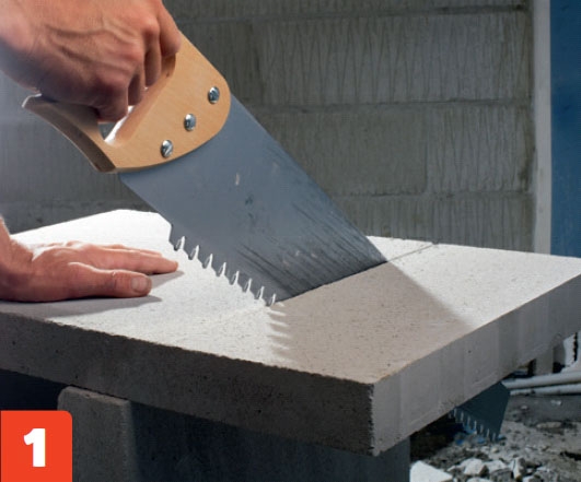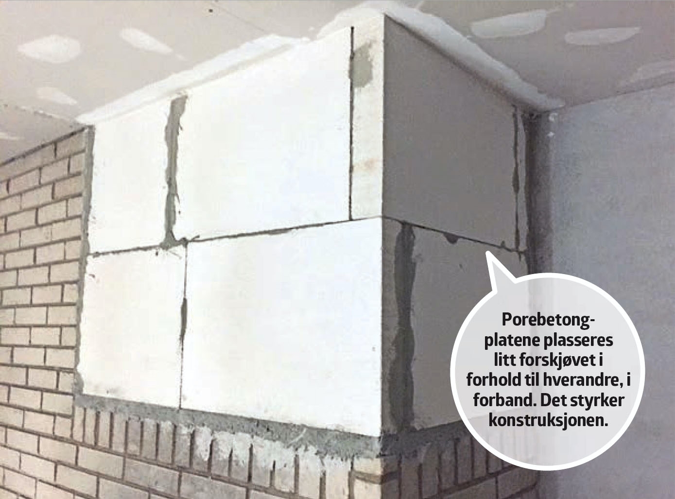 Over peisen er det et åpent rom som skal fylles ut, slik at den fremskutte veggen med peisen blir enklere. Den jobben ordnes med porebetongplater. Da kan veggen pusses til en jevn flate, som kan kles med naturstein. Porebetongplatene er forholdsvis store, og de er enkle å skjære til. Det skal derfor ikke brukes særlig mange for å fylle ut hullet. Platene skjæres til med en grovtannet sag, og limes sammen med et eget lim for pore-betong. Platene settes i forband, for å styrke konstruksjonen. Platene fås i forskjellige standardstørrelser og -tykkelser, og er mest kjent under navnet siporex.