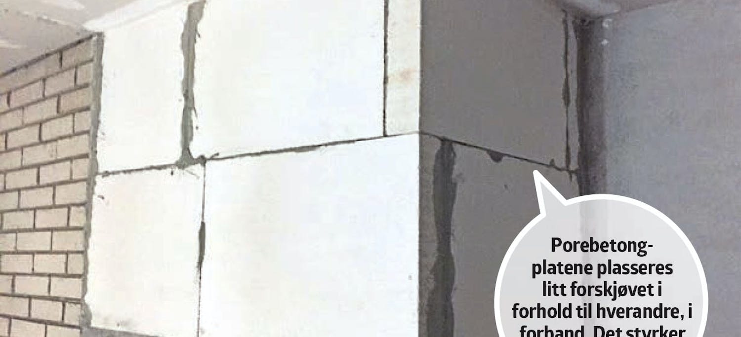 La steinene på forsiden stikke litt utover hjørnet, slik at de flukter presist med steinene på den tilstøtende veggen. Det gir den peneste sammenføyningen.