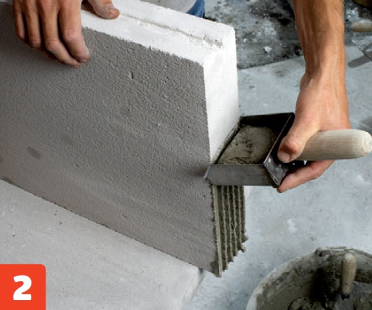 Trekk på det andre pusslaget så jevnt som mulig. Mørtelen her skal være litt tykkere, og trekkes best på med et stålbrett nedenfra og opp.