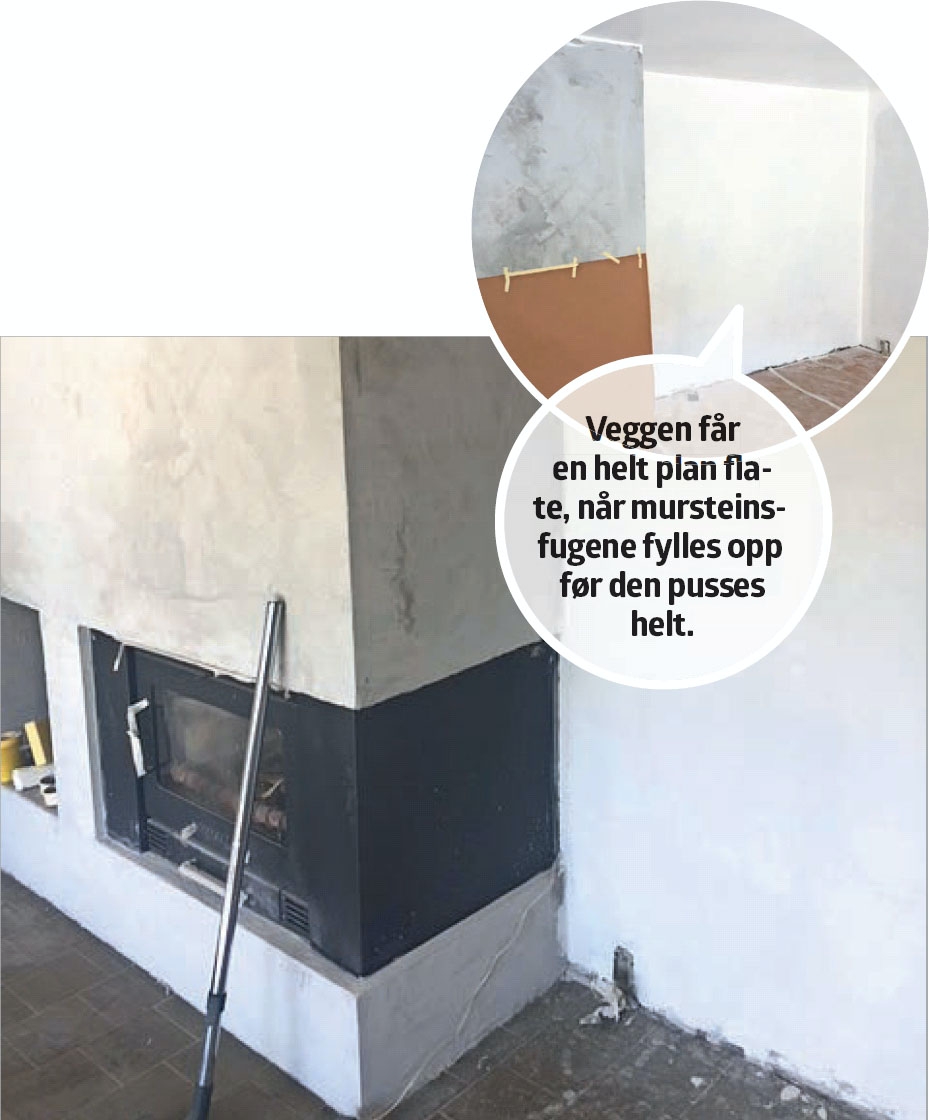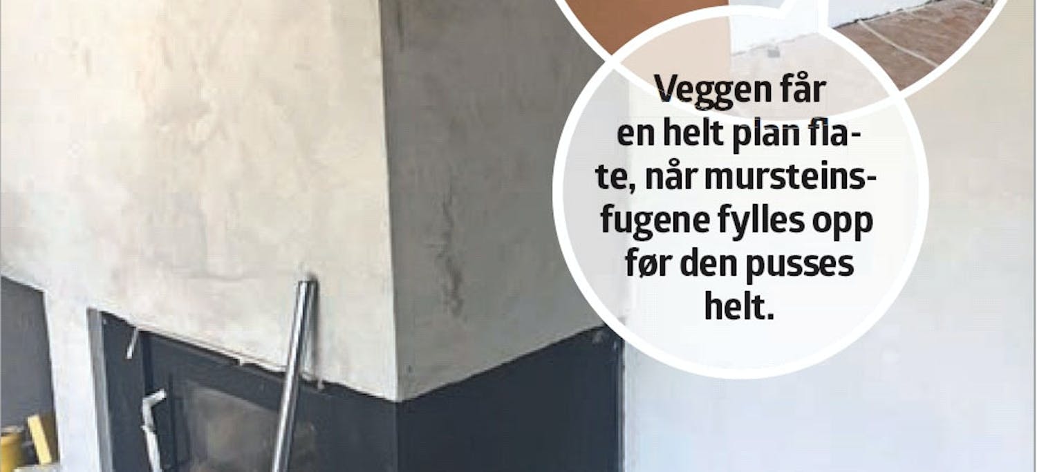 Før det kan settes opp skiferpanel på peisveggen, skal den pusses til en jevn flate. Først fylles fugene i mursteinsveggen, deretter pusses det, typisk med to lag puss. Vi anbefaler multipuss til oppgaven, fordi den er enkel å jobbe med og har god vedheft mot underlaget.