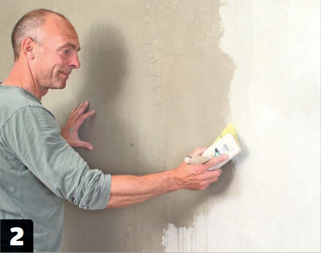 Veggen fuktes før det andre laget. Det sikrer at pussen hefter bedre og ikke tørker for raskt. Bruk en murkost og rent vann.