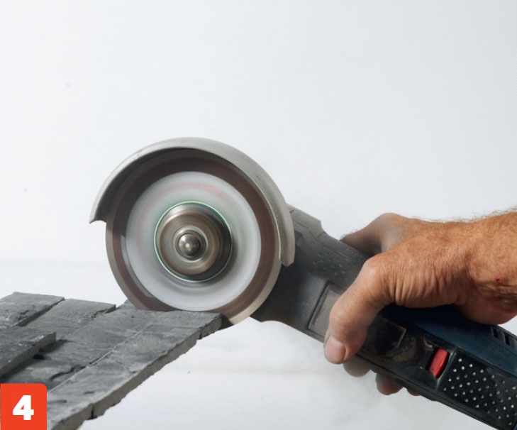 Steinene kappes til i endene med en vinkelsliper. Det kan være hardt arbeid for vinkelsliperen, så det er en god idé med en sterk og ny skive. Husk å bruke støvmaske, hørselvern og vernebriller.