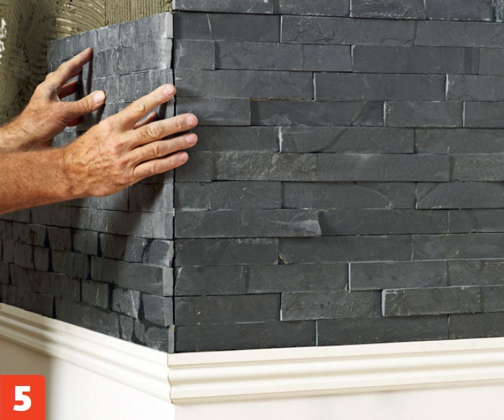 Skiferpanelet settes opp med flislim, som smøres på veggen i mindre porsjoner om gangen. Steinene skal plasseres helt tett, uten en fuge mellom. Når alle steinene er satt opp, er veggen ferdig. Du må dog fuge med en akrylfugemasse rundt i kantene mot taket og veggene for å få en pen finish.