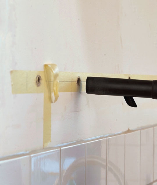 Gjengestengene støpes fast. Limet sprøytes inn i hullene med fugepistolen, og straks etter skrus stengene inn i limet. Limet herder raskt, så du skal jobbe raskt for at det ikke skal herde i pistolen.