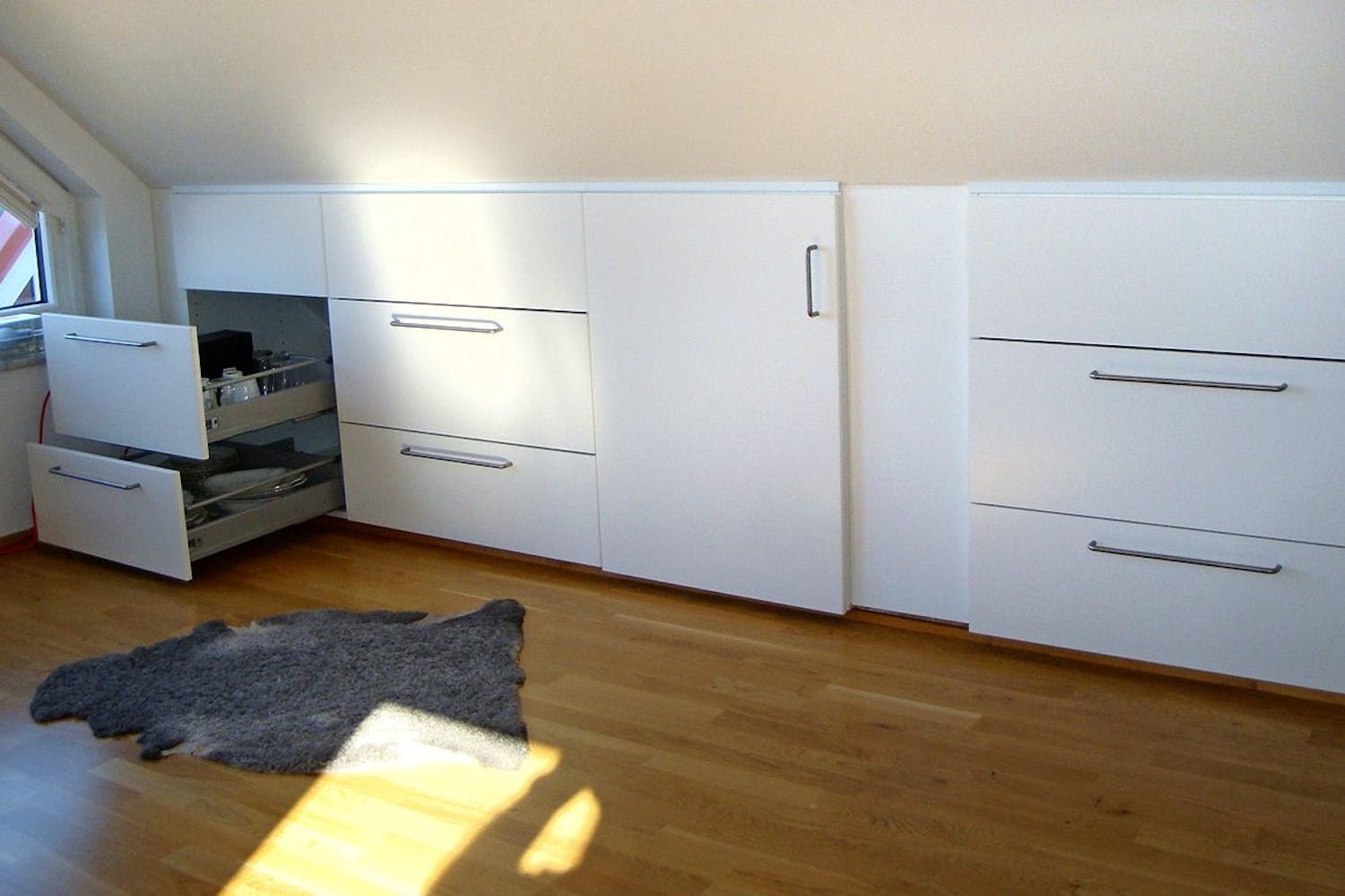 Jeg regnet ut at hvis jeg hevet skapene litt, kunne jeg få plass til to uttrekksskuffer i hvert – en dyp nederst og en kortere øverst. Det krevde at jeg lagde en sokkel til skapene. Sokkelen måtte også skråskjæres bakerst, slik at den kunne passe mot skråtaket. Mellom de to skrå sidene i skapveggene har jeg satt opp tverrstivere, så skapene står stabilt og passer nøyaktig til uttreksskuffene, som monteres på skinner. Det var en stor jobb, men det har gitt mye oppbevaringsplass, som vi allerede har fylt opp. K.N."