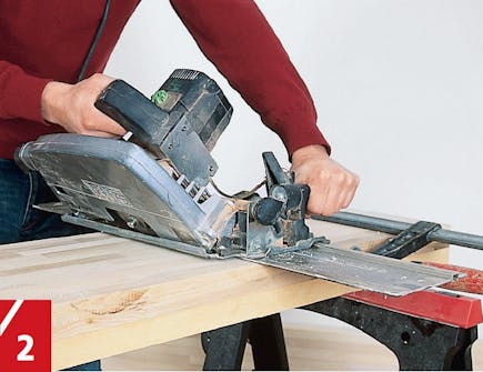 Når du skal sage til hyllene, er det prak-tisk å legge benkeplata på et par lekter festet til to bukker. Bruk føringsskinne eller et rett bord å sage etter når du skal dele plata langsetter med sirkelsag. Av-rund framkantene med en overfreser eller grovt slipepapir. Så skal du sage til hjørnene. Har du ikke sirkelsag med stor skjæredybde, kan du sage endene i rett vinkel og føye sammen delene med plugger - velg da metode fire.