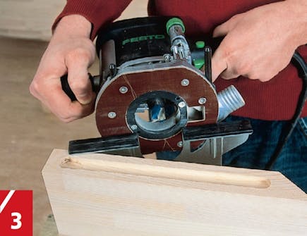 Legg sålen på sirkelsaga på hylla med sålen opp til plata som blokkerer slik at bladet stopper i riktig dybde. Lag tre spor med sirkelsaga.
