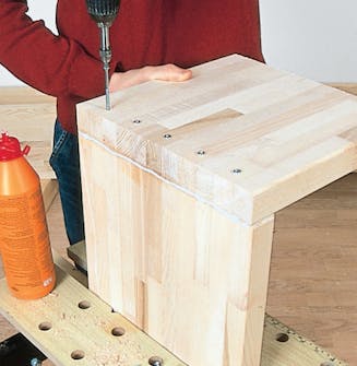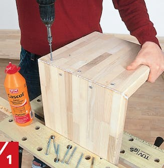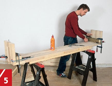 Bor opp midt i stavene til fem skruer med 4,5 mm bor, og fest de to platene sammen med lim og skruer (f.eks. 5 x 80 mm). Til denne sammenføyningen behøver du ikke å bruke skrutvinger.