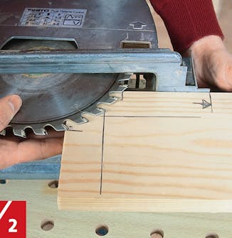 Lag streker 4 cm fra kantene. Innstill sag-bladet på full dybde. Hold saga mot hjørnet slik at bladet er 5 mm fra å skjære gjennom. Trekk en strek nøyaktig foran sagas bunn-plate (ved pila). Bruk ei plate som stopper.