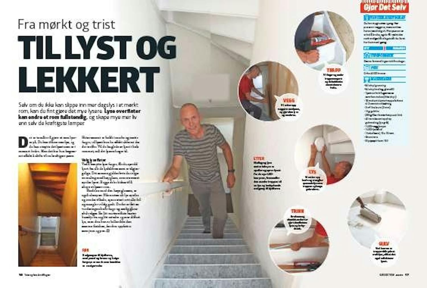 Det siste ekstra lyset henter vi på kjellergulvet. Den gamle og delvis avskallede malingen fornyes med en lys og blank gulvmaling med en glans på 80. Det gir en blank overflate, som speiler lyset fra et vindu nede i kjelleren og bidrar til et lyst og vennlig trapperom.