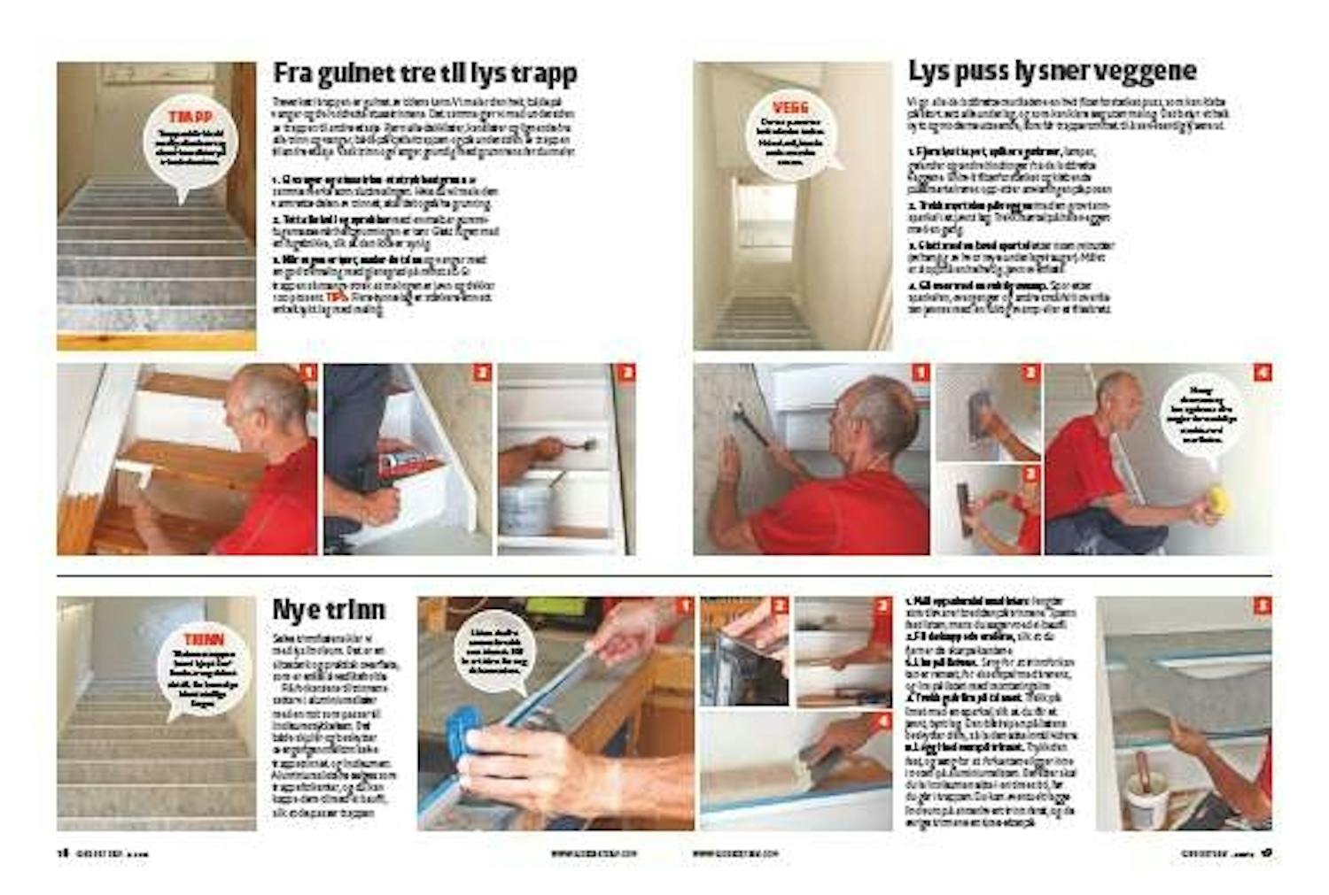 Treverket i trappen er gulnet av tidens tann. Vi maler den hvit, både på vanger og de loddrette stusstrinnene. Det samme gjør vi med undersiden av trappen til andre etasje. Fjern alle dekklister, kantlister og lignende fra alle trinn og vanger, både på kjellertrappen og på undersiden av trappen til andre etasje. Vask trinn og vanger grundig med grunnrens før du maler.