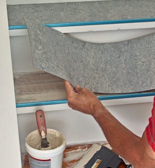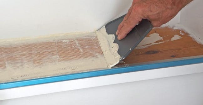 Trekk gulvlim på trinnet. Trekk på limet med en sparkel, slik at du får et jevnt, tynt lag. Den blå teipen på listene beskytter dem, så la den sitte inntil videre.