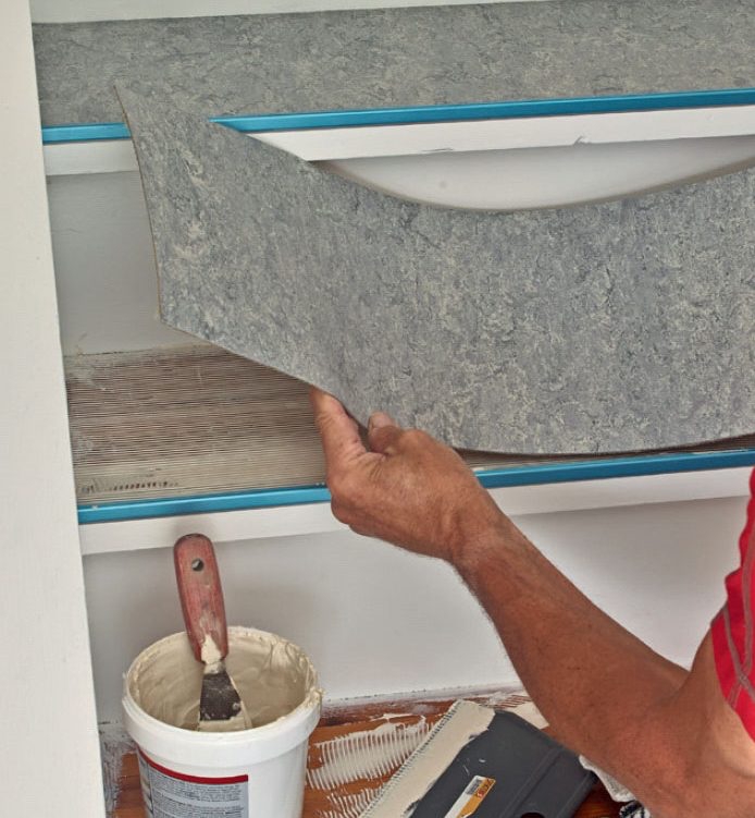 Selve trinnflatene kler vi med lys linoleum. Det er en slite sterk og praktisk overflate, som er enkel å vedlikeholde. På forkantene til trinnene setter vi aluminiumslister med en not som passer til linoleums tykkelsen. Det både skjuler og beskytter overgangen mellom selve trappetrinnet og linoleumen. Aluminiumslistene selges som trappeforkanter, og du kan kappe dem til med ei baufil, slik at de passer trappen.