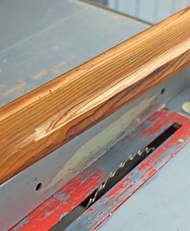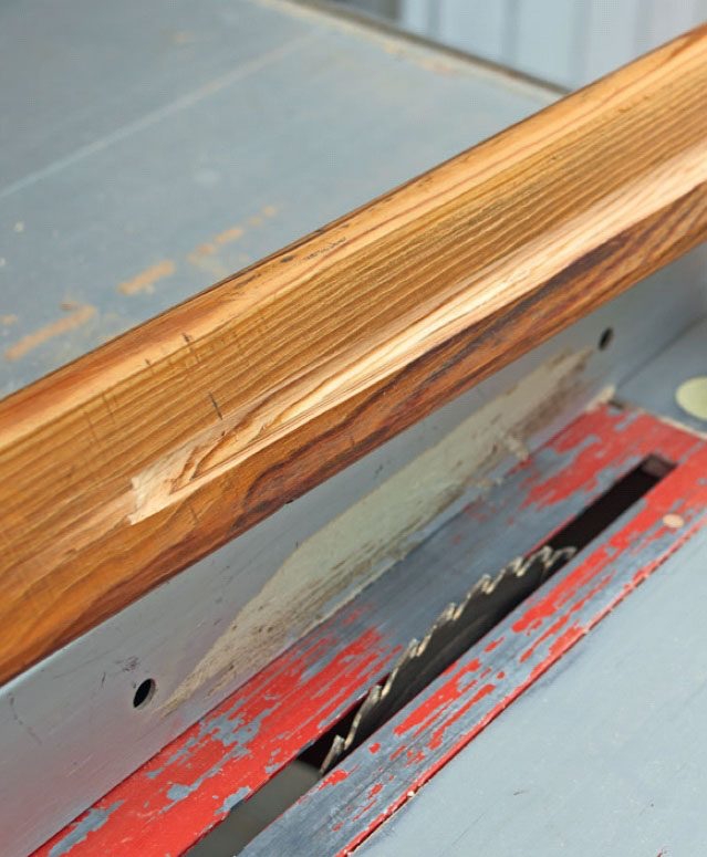 Vi setter et lysbånd bak gelenderet, og utnytter en av LED-lysets mange nye muligheter. Lysbåndet opptar veldig liten plass og kan klippes til på mål. Med bord sirkelsagen og et smalt stemjern lages en not i gelenderet. Noten passer til lysbåndet vi har kjøpt, slik at det skjules fullstendig. Noten kan også lages med en overfres.