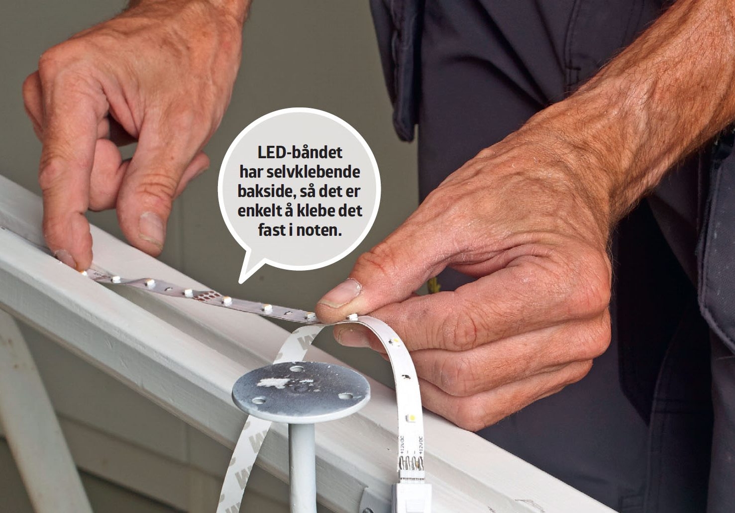 Lysbåndet klebes fast når gelenderet er malt hvitt. Trykk den selvklebende strimmelen av lysdioder fast i bunnen av noten. Begynn fra den ene enden, og kapp lysbåndet så det passer i lengde.
