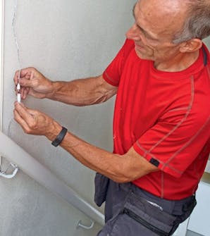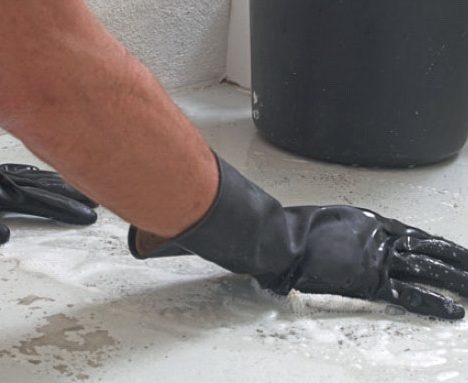 Fjern løst tapet, spiker og skruer, lamper, gelender og andre hindringer fra de loddrette veggene. En hvit fiberforsterket og klebende pussmørtel røres opp etter anvisningen på posen.