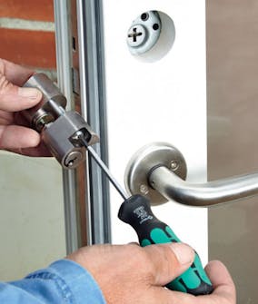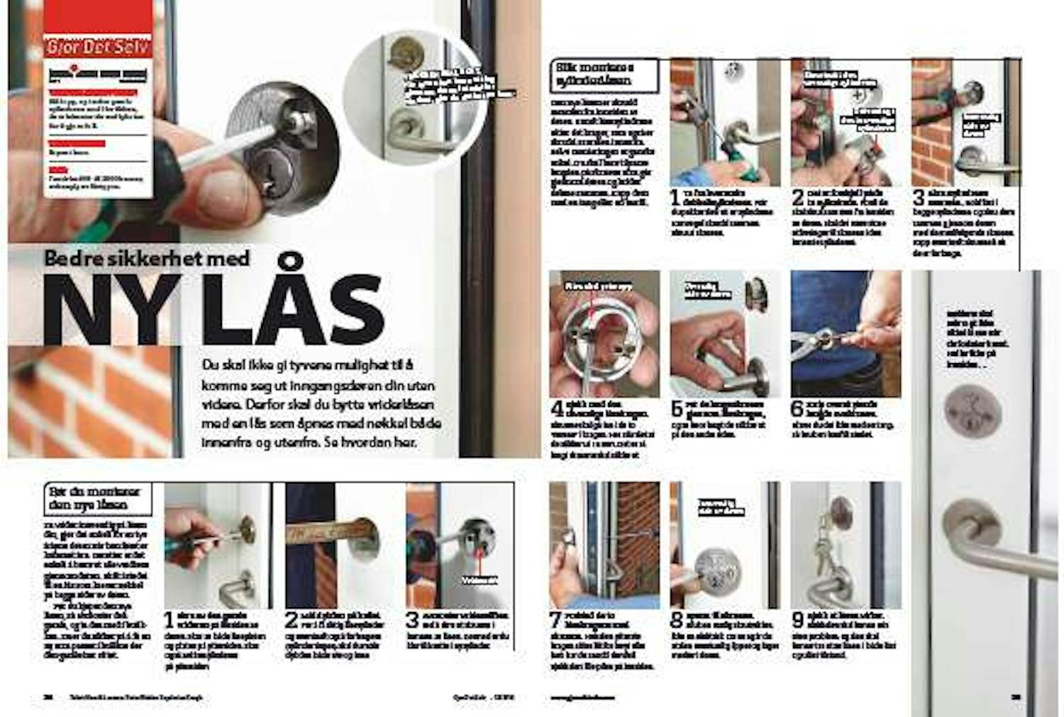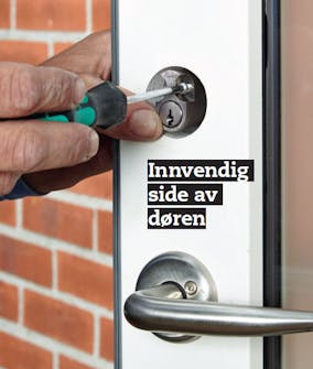 Den nye låsen er skrudd sammen fra innsiden av døren. Rundt låsesylindrene sitter det krager, som også er skrudd sammen innenfra. Selve monteringen er ganske enkel. Du skal bare tilpasse lengden på skruene som går gjennom døren og holder delene sammen. Kapp dem med en tang eller en baufil.