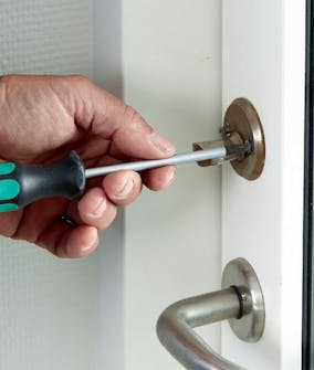 Skru av den gamle vrideren på innsiden av døren. Skru av både låseplaten og platen på yttersiden. Skru også av låsesylinderen på yttersiden.