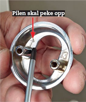 Sjekk med den utvendige låsekragen. Skruene skal gå inn i de to “rørene” i kragen. Her står det at de stikker ut 13 mm. Det er så langt skruene skal stikke ut.