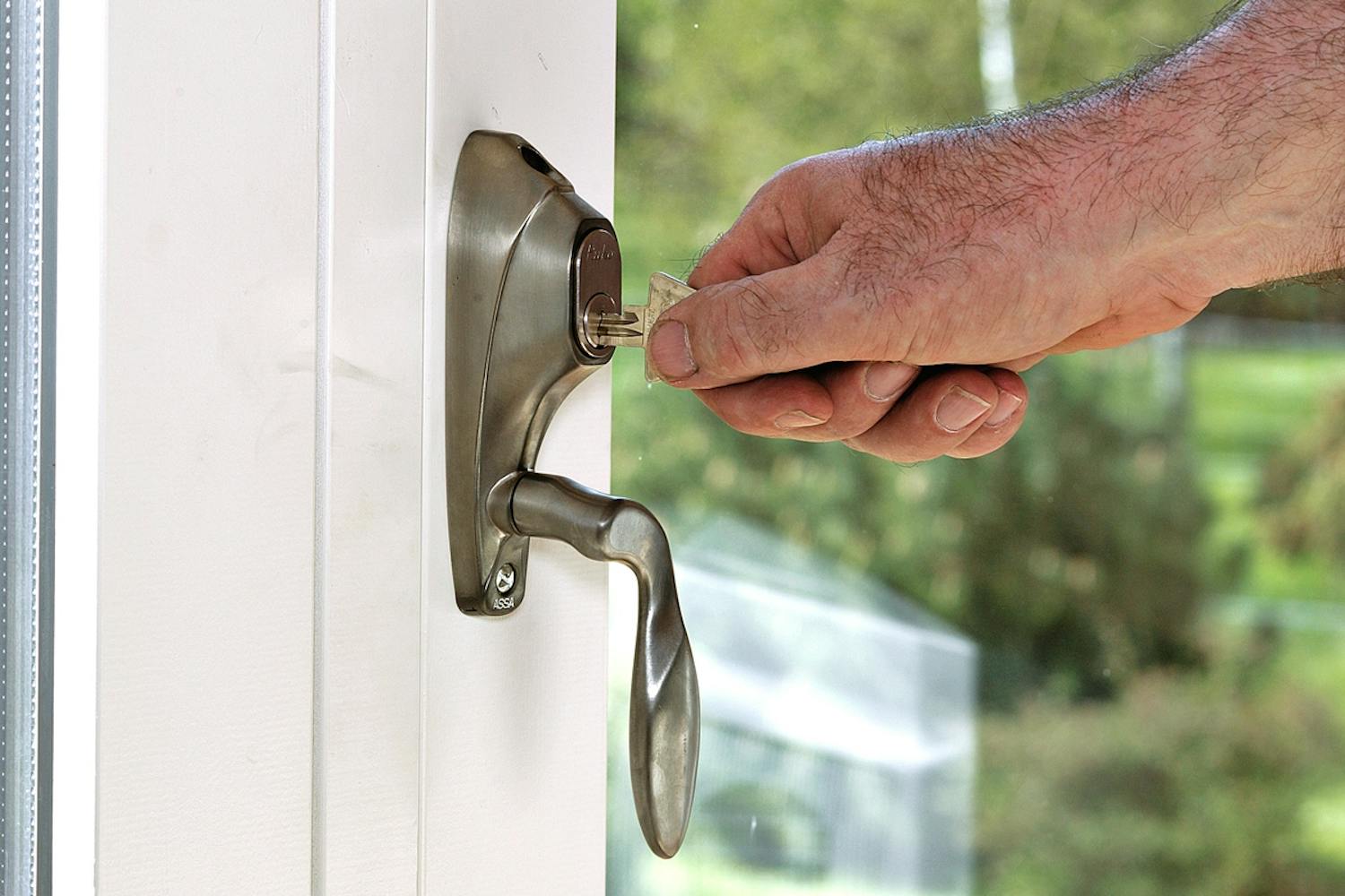 Den beste måten å sikre en skyvedør eller en terrassedør på, er ved å bytte ut håndtaketmed et nytt med innebyggetlås. De kan du få kjøpt med både nøkler og kodelås. Håndtak med lås kan også brukespå vinduer, slik at de blir bedre sikret mot innbrudd. Noe av det siste på markedet, er kodelås med fjernkontroll, som kan låse flere låser samtidig.