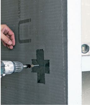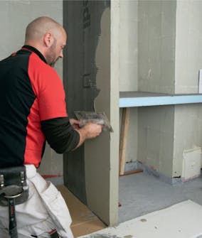 Veggen bygger vi av en våtromsplate, som består av en skumkjerne med et millimetertynt lag puss og armering på begge sider. Platen er sterk, men skruer får bare helt lett fatt i den, så den limes til vegger og gulv.