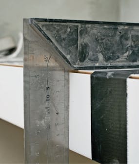 Vinkelen sjekkes. Samtidig forsikrer vi oss om at de to fliskantene sitter like langt fra spissen i vinkelen, slik at fugen mellom dem er 45 grader.