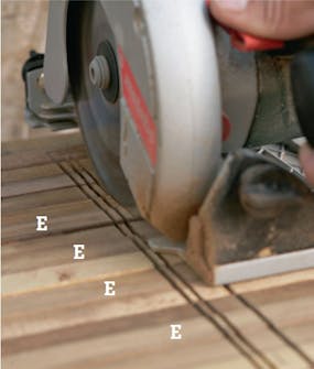 Sporene til de kortere tverrlistene (D) skjæres 7 mm ned i de lange listene (E). Sidene skjæres nøyaktig med sirkelsagen. Deretter kjører vi tre-fire ganger i samme dybde mellom de to sporene.
