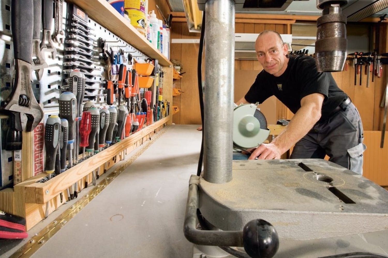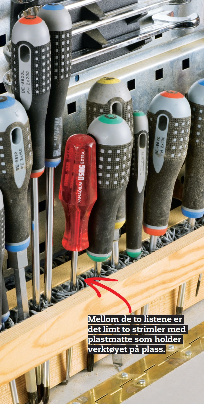 Denne verktøyholderen er en av de detaljene Jann Wagner setter mest pris på i verkstedet: To strimler plastmatte montert på et par lister holder fast på skrutrekkere, tenger og blyanter. Slutt med tungvinte spesialholdere: Sett skrutrekkeren ned mellom mattene, og du kan alltid fi nne den igjen. Spissen kan du nemlig se under lista.